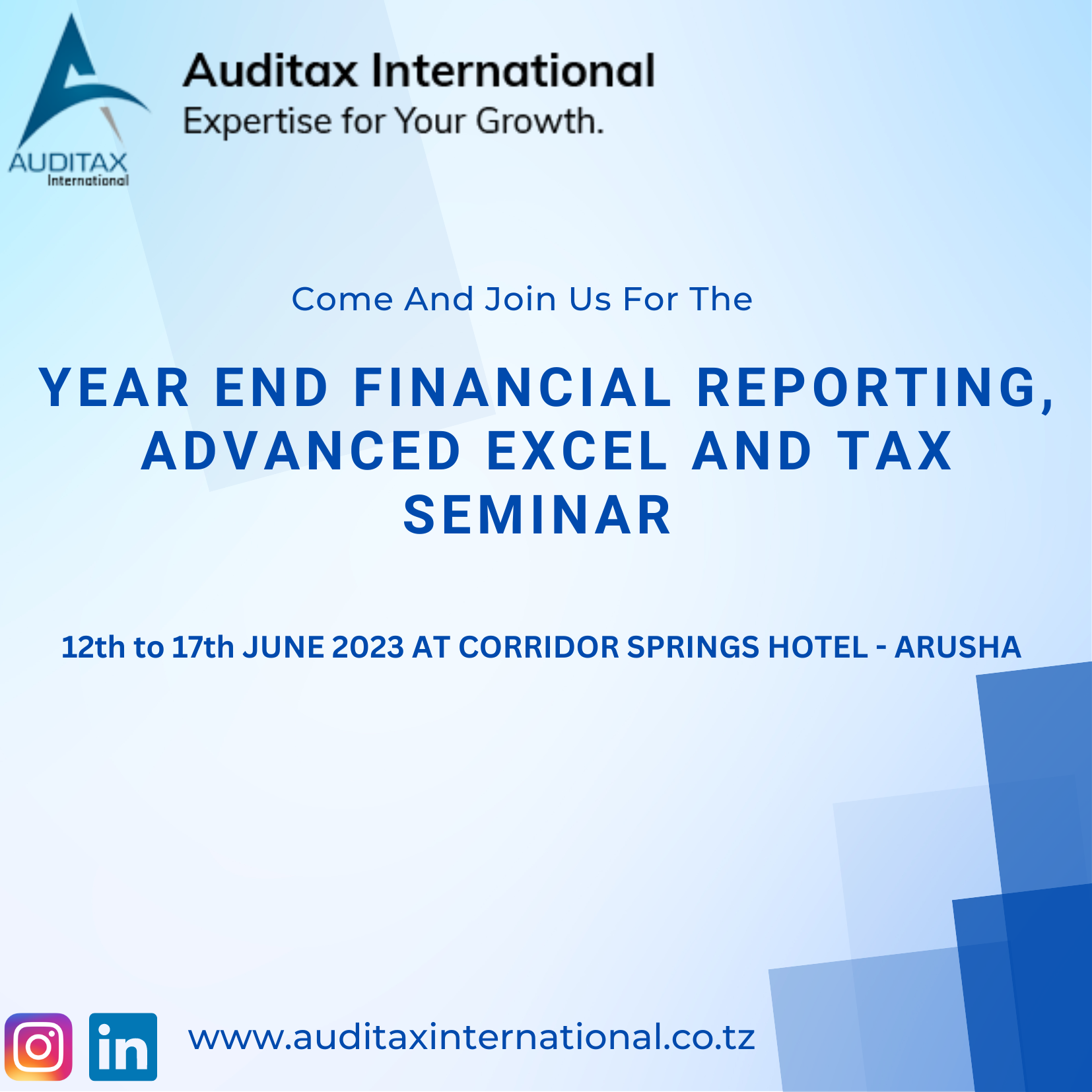 A PRACTICAL 6 DAYS YEAR END FINANCIAL REPORTING, ADVANCED EXCEL AND TAX SEMINAR WITH CPD HOURS TO BE HELD AT CORRIDOR SPRINGS – ARUSHA FROM 12TH TO 17TH JUNE 2023